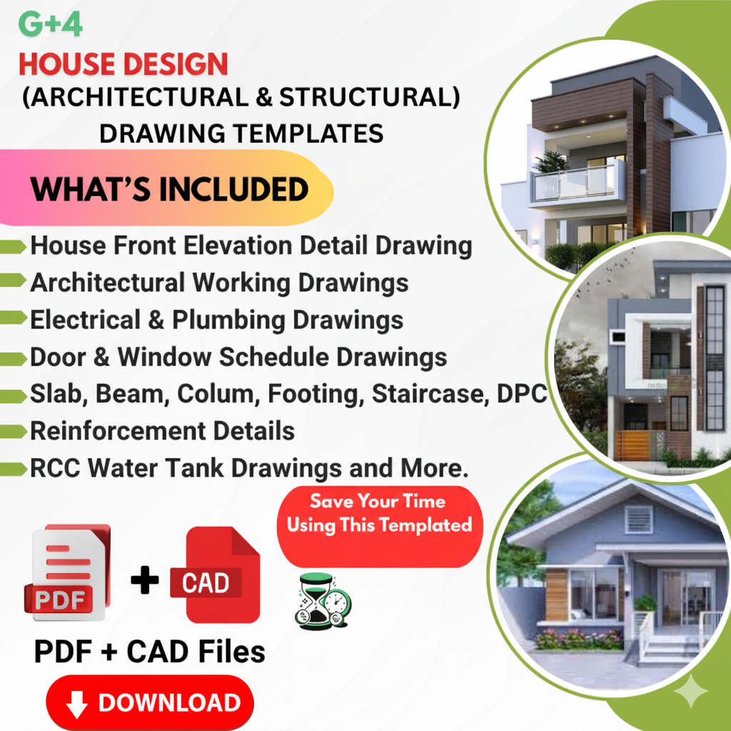 This package includes complete G+4 building drawings covering structural, architectural, electrical & plumbing layouts. Designed by professionals, these templates save time and ensure accuracy for engineers, architects, and students.